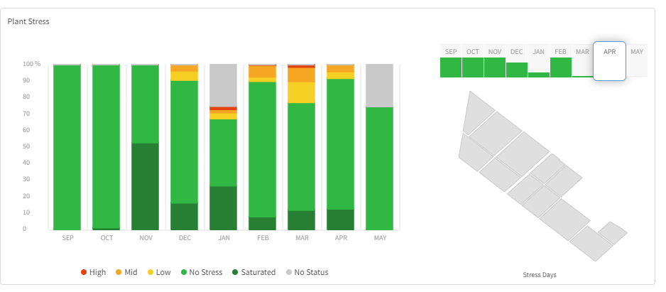 ![]() A dashboard image of a monthly plant stress analysis for Duxton Nuts Duxton Nuts also employs a Precision Surface Irrigation (PSI) technology, which helps the company to capture surface water during high rainfall periods for irrigation use. With the recent construction of an on-site 400ML dam, the business further increases water use efficiency by utilising the full capacity of the dam three times annually, with most water being captured surface water. |